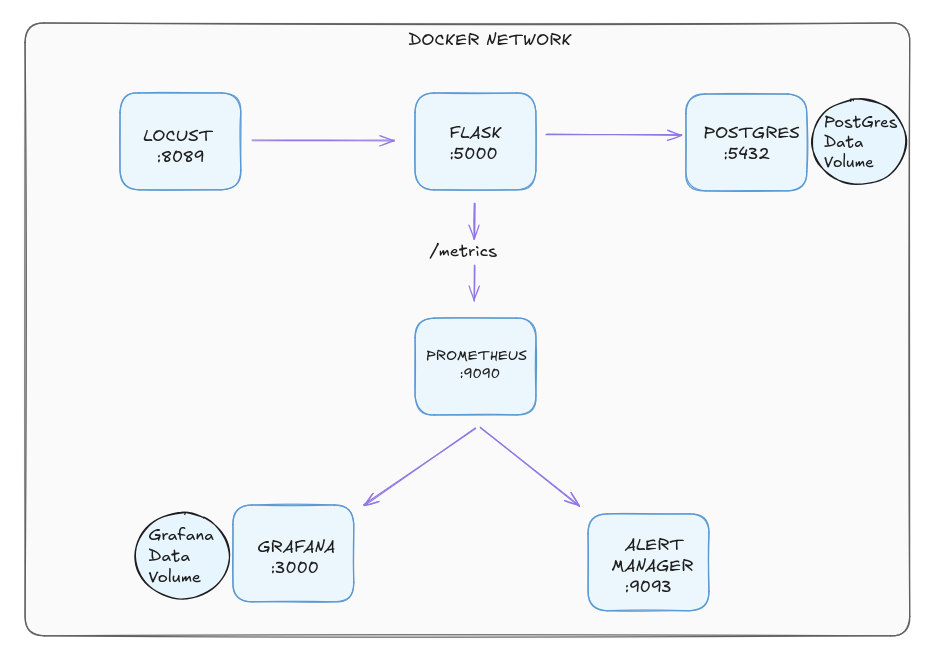 containerised Flask and PostgreSQL support ticket API with full observability — Prometheus metrics, Grafana dashboards, Alertmanager alerting, and Locust load testing, orchestrated with Docker Compose..